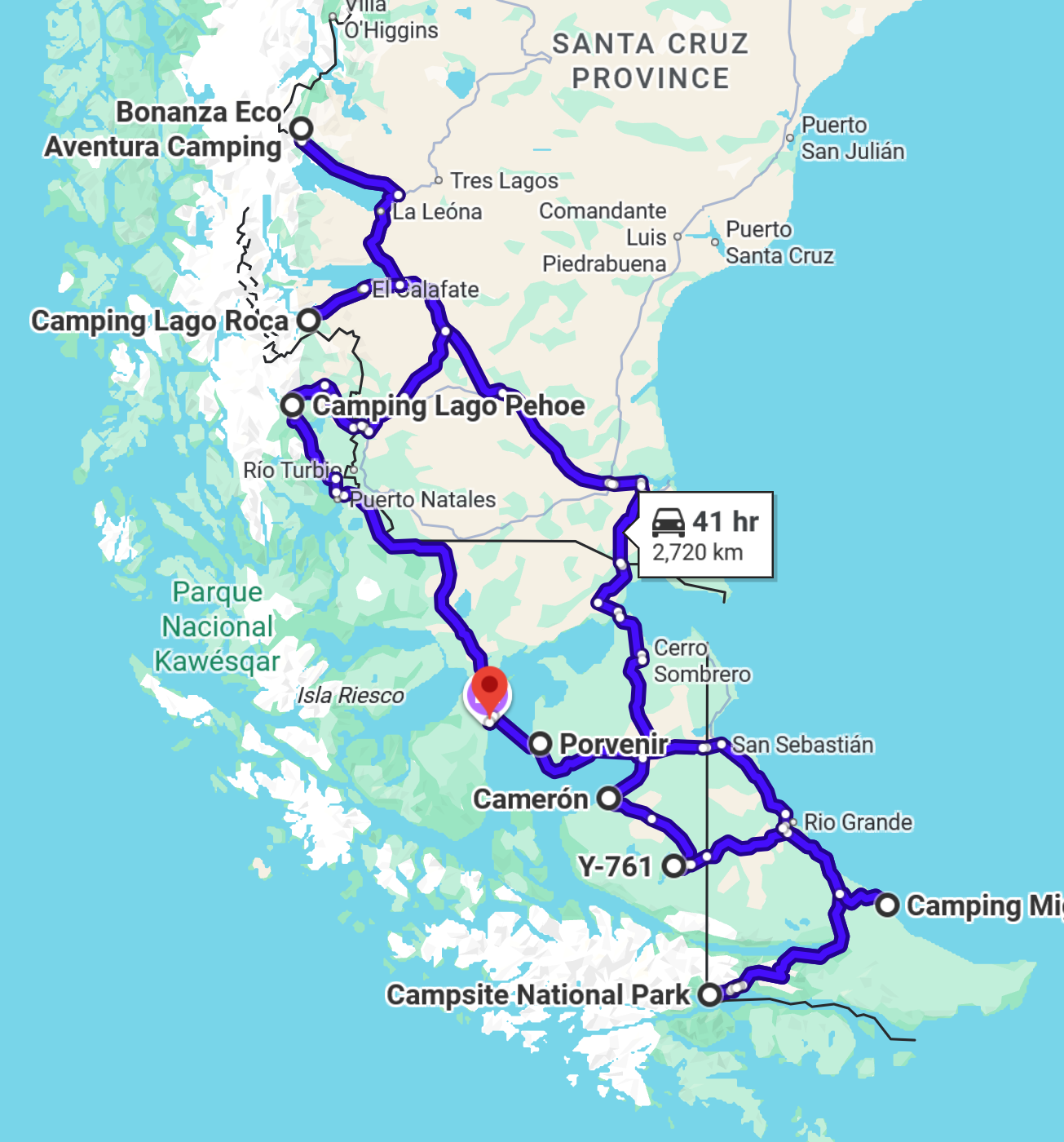 Our trip this year begins February 17 in Punta Arenas, Chile, situated on the Strait of Magellan and close to the southern tip of the mainland of South America. From there, we will take a ferry across the Strait to the archipelago of Tierra del Fuego for a week of exploration, beginning with a visit to a King Penguin colony and ending with a couple of days of hiking in Tierra del Fuego National Park outside of the bustling tourist town of Ushuaia, Argentina. Then we will make our way slowly north back to the mainland and on to Glacier National Park and several days of hiking – weather permitting – outside of the small mountain adventure towns of El Chalten and El Calafate. Lastly, we will make our way back south to Torres del Paine National Park in Chile before returning to Punta Arenas. Here’s a look at our intended route, starting in Punta Arenas (the red waypoint on the map) and heading south on a counter-clockwise loop with a few side excursions, and eventually landing back in Punta Arenas: