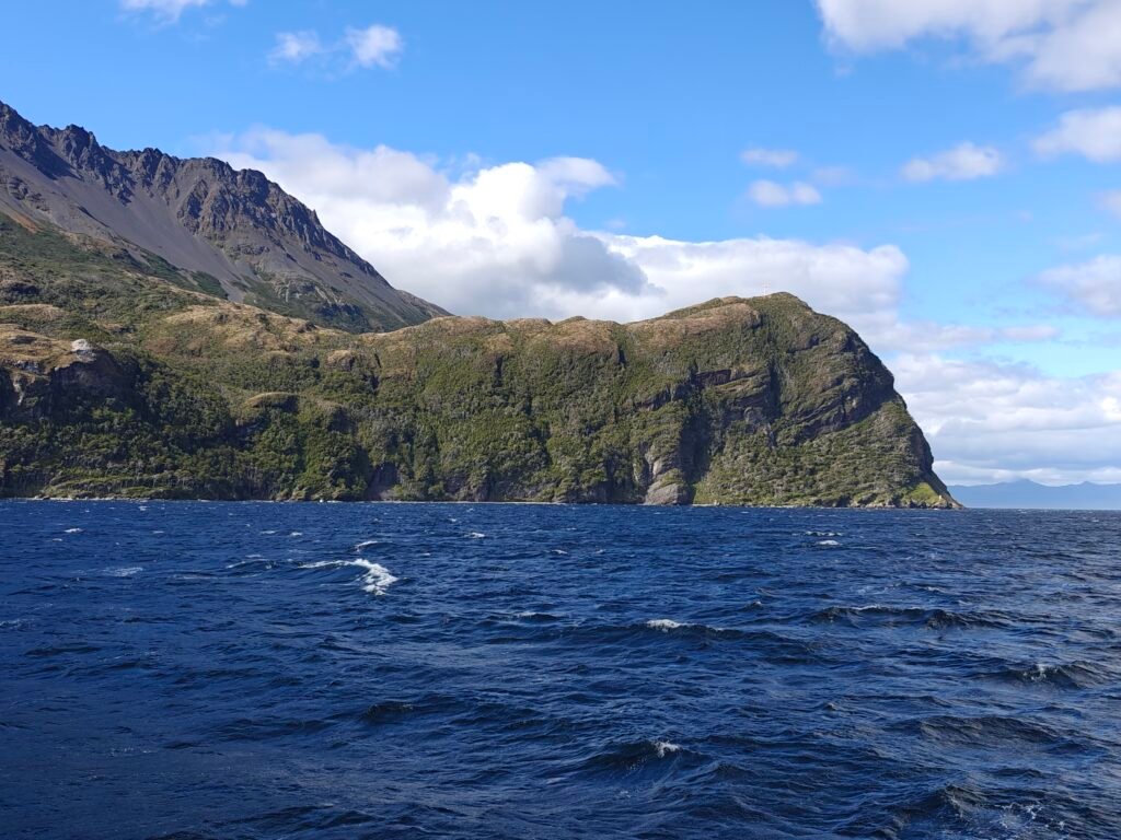 Now for a tiny bit of history! The Strait of Magellan, of course, is named after the famed Portuguese explorer Ferdinand Magellan, who was the first to attempt to circumnavigate the world in the name of Spain between 1519-1522. You may recall that he fell short of his goal, dying in a battle in the Philippines in 1591 just short of his goal, but his crew did complete the voyage. Magellan pioneered the 350-mile long navigable route through the fjords and channels between the mainland and Tierra del Fuego, thereby circumventing the treacherous ocean-going route – which can have 80-foot waves at times – around the southern-most islands of Tierra del Fuego – Cape Horn. The Strait is used today by cargo and passenger ships traversing from the southern Atlantic to the southern Pacific Oceans and either avoiding the costly passage through the Panama Canal or too large to use the Canal. And did you know that Magellan also gave us the name for the Pacific Ocean.