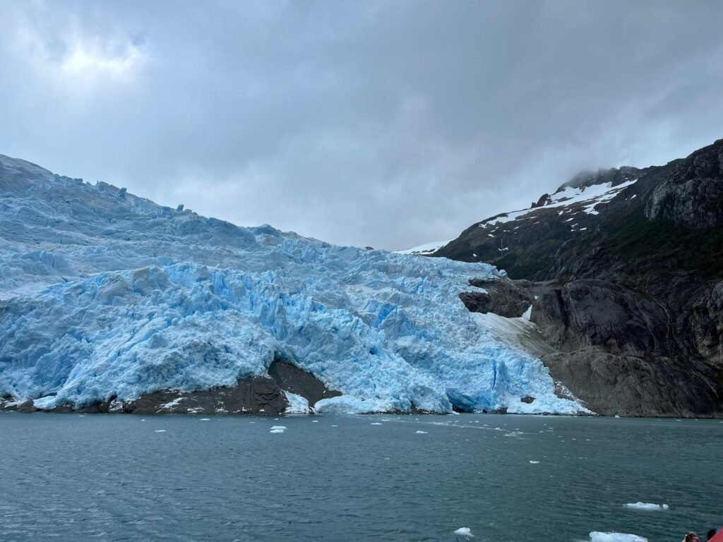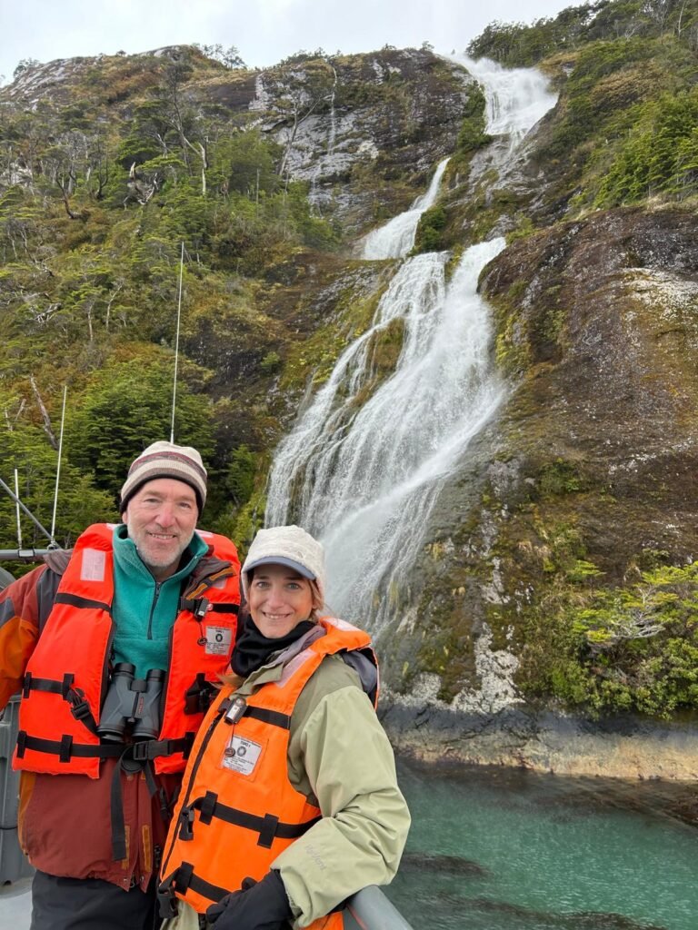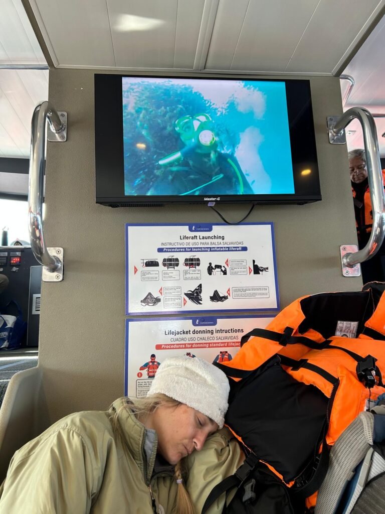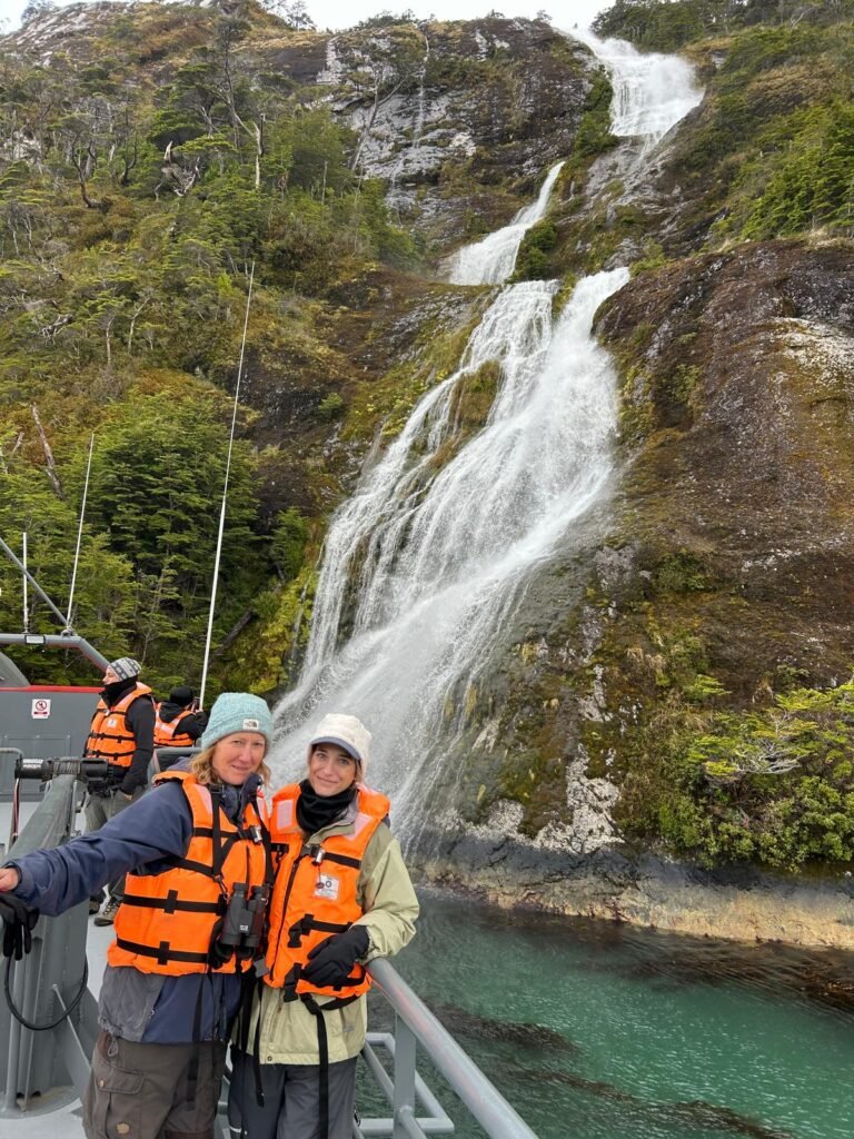 Our tour boatTypical intermittent rain and wind in the Strait of MagellanCape FrowardHumpback whale flukeMe and the doodle at a fjord waterfallNancy and the doodle at the fjord waterfallTidewater glacier in Francisco Coloane Marine ParkAlcoholic drink at the glacier on the rocks made from glacial ice!Caitlin dreaming of scuba dives to come (see dreamscape in the screen above) Boat ride home after a long day