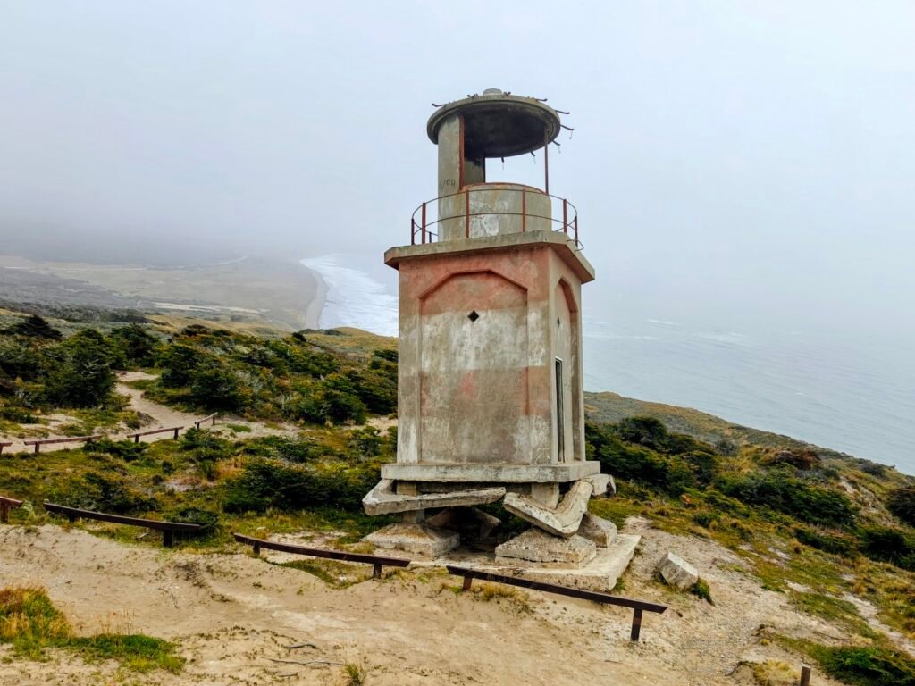 Cabo San Pablo is a small coastal community – if you can call it that, since there are only ~6 beach shacks strung out along about 1 km of coastline – on the southeast coast of Tierra del Fuego (see map above). This is a very remote part of Tierra del Fuego. We didn’t see a single car for the entire hour drive out to Cabo San Pablo from the main highway. Cape San Pablo is a small isolated mountain that stands out from the coast forming small bays on either side. Atop the Cape is a lighthouse dating back to 1945 that is no longer functional since it nearly collapsed during an earthquake and is just a skeleton today. Here’s what it looks like hiking to the “lighthouse” and the leaning lighthouse itself: