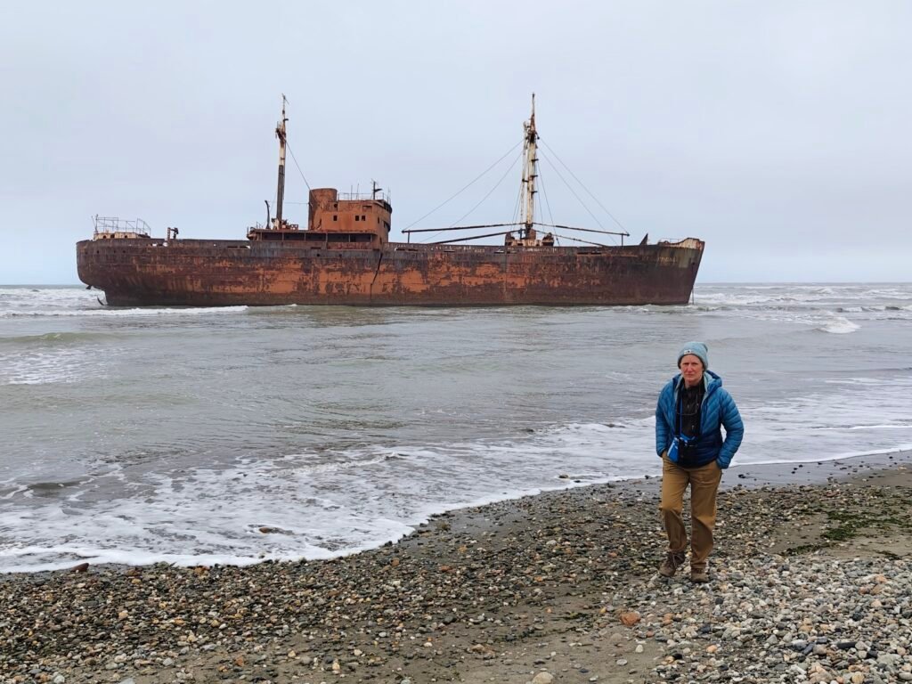 The shallow bay to the south of the Cape hosts a huge shipwreck, the “Desdemona“. This was a German cargo ship, carrying bags of cement of all things, up the coast when it ran into mechanical problems, caught on fire, and was abandoned just offshore in 1985. Its metal hulk stands just offshore from our campsite as a stark reminder of how dangerous the waters around the bottom of South American can be, even to modern ships. Here she is: