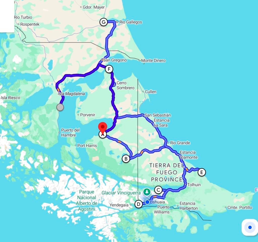 We began our overland journey from Punta Arenas by crossing the Strait of Magellan to the archipelago of Tierra del Fuego. Our first stop was the King Penguin colony at Parque Pinguino Rey, a protected area located in Bahia not far from the town of Cameron (see A on the map below).