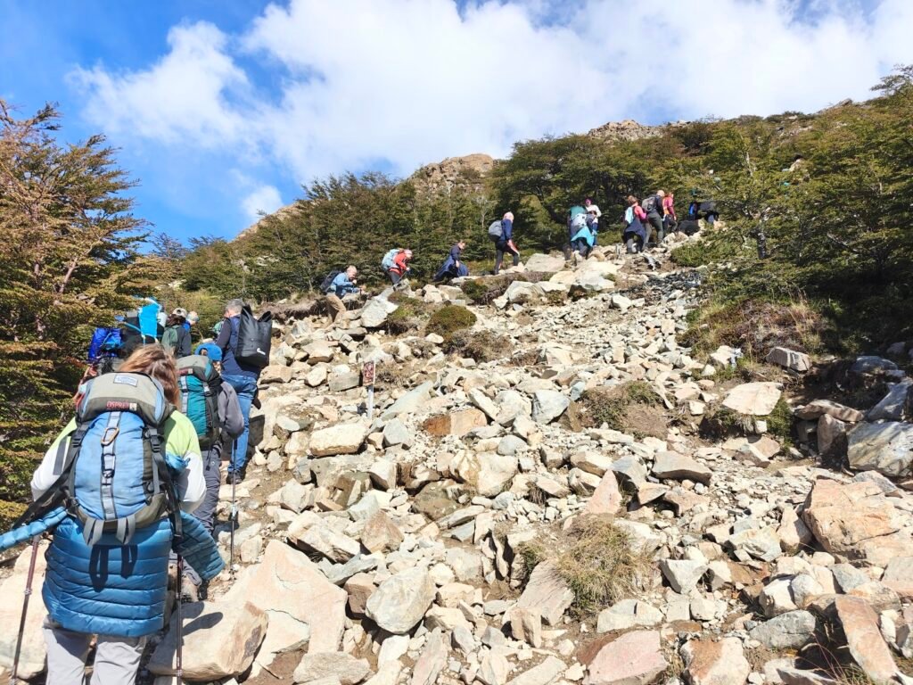 We did three major hikes during our stay. The first was a serious all-day 3,500-foot climb to the cirque lakes below Fits Roy and its glaciers (Laguna de los Tres). This was a wonderous hike that followed a glacially-carved valley up to the base of Fitz Roy. We hiked much of the way through that classic evergreen beech forest of Patagonia before climbing above tree line. The only downside of this hike was the hundreds of other hikers on the trail. This hike is considered the one “must do” hike in El Chalten, that is if you are physically able to meet the challenge. There were times we were trapped in a long string of hikers with no way to advance or retreat – argh! During the steepest ascent near the top it felt like what it must be like these days on the Hillary Step portion of the Mount Everest climb. Here’s what that looked like: