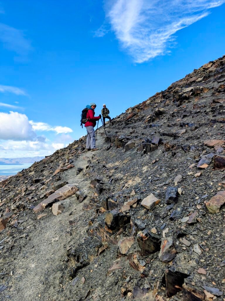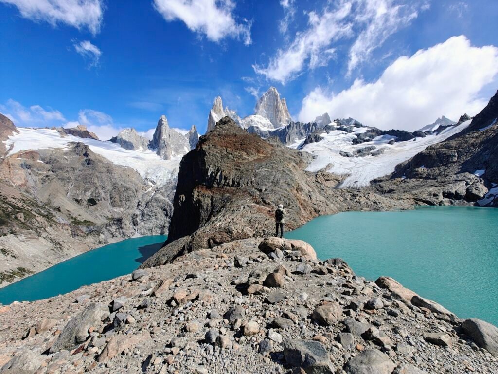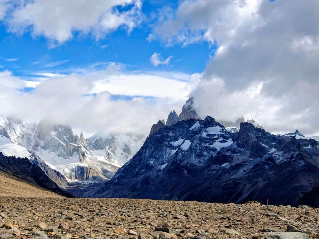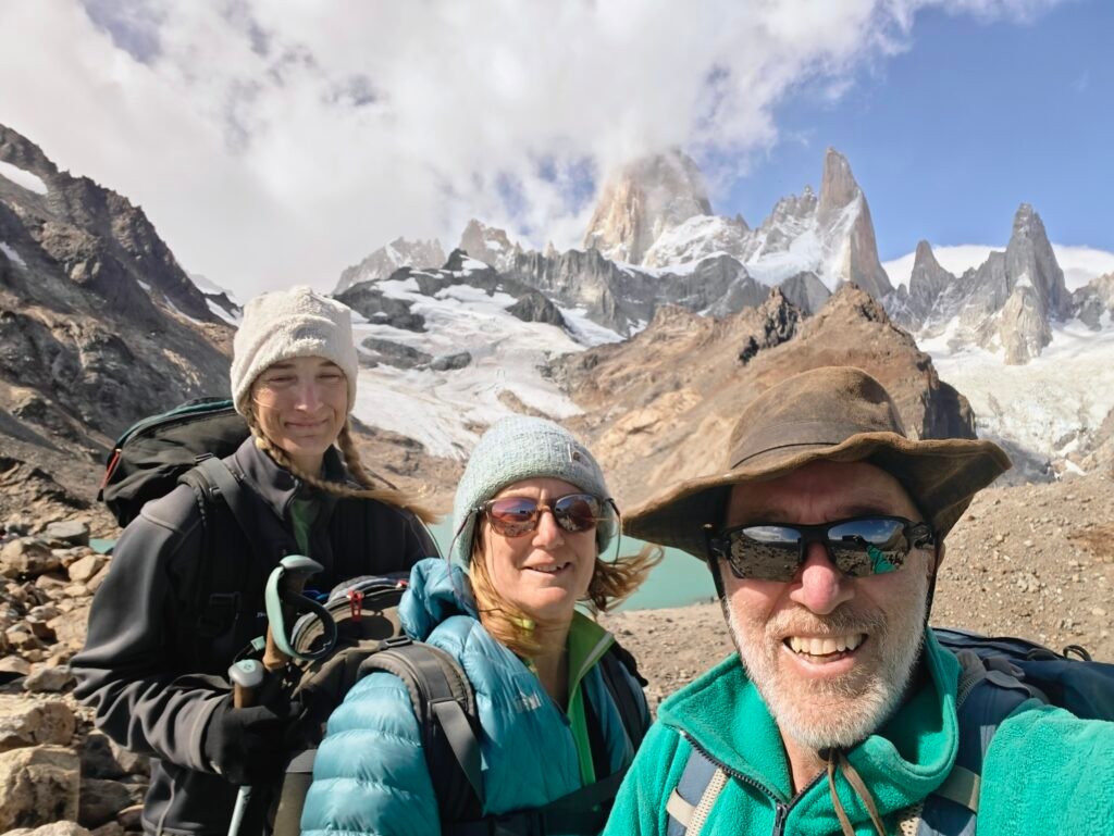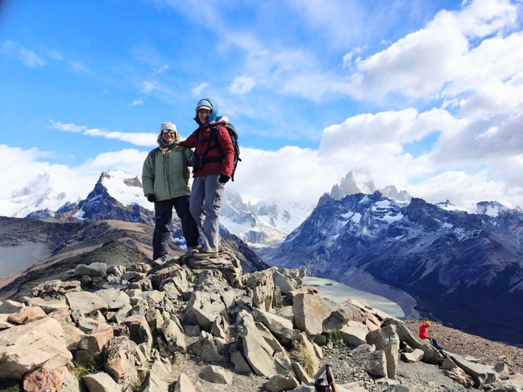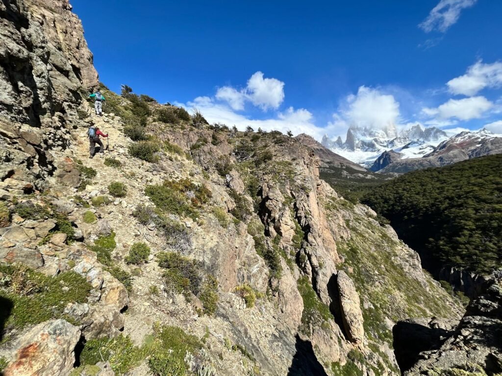 Day three was another spectacular hike climbing 4,000 ft up to a peak (Loma del Pliegue Tumbado) overlooking the Fitz Roy massive and neighboring peaks. The hike was all about panaramic views of the high peaks, and it didn’t disappoint. The weather, once again, cooperated beautifully. A bit windy at times, but we had enough breaks in the wind and plenty of sunshine, that with proper outer gear we were quite comfortable. Here’s a couple of pics of that epic hike: